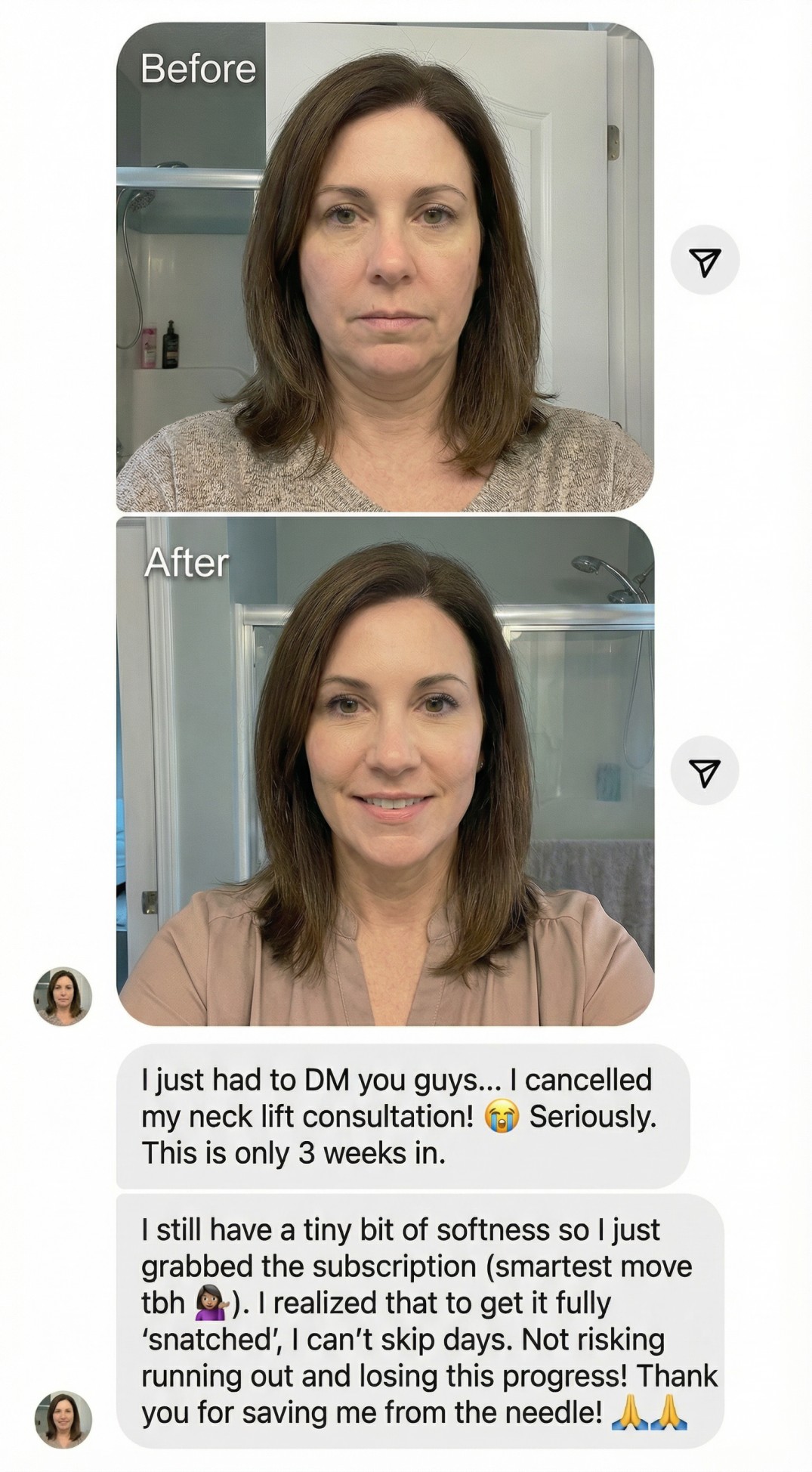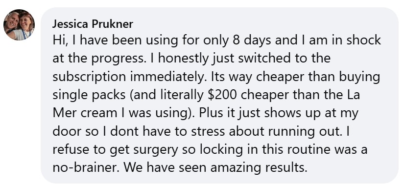 I immediately resubscribed and learned my lesson: this is NOT a one-time fix. It's a LIFESTYLE. Your skin is constantly aging. Gravity is relentless. If you stop, it comes back. The subscription isn't optional if you want to KEEP the results."
